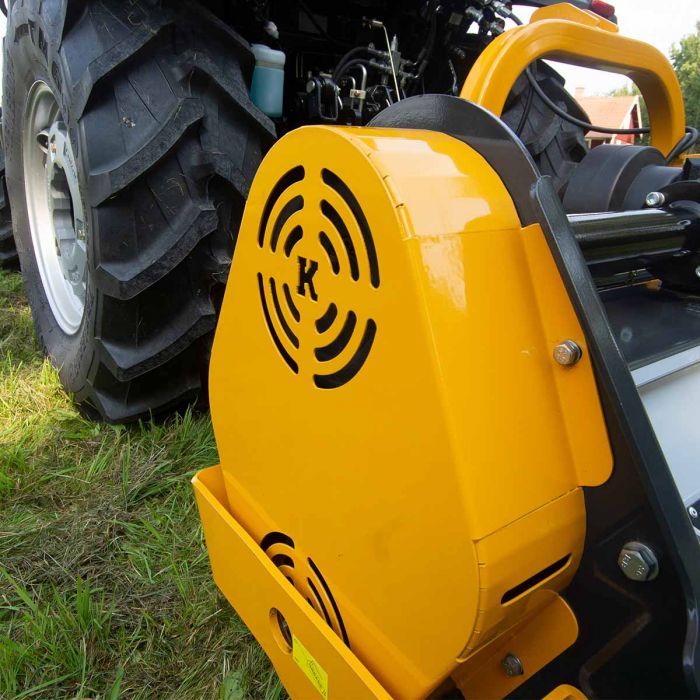 An der Vorderseite verfügt der Mulcher über einen Kettenschutz, der dem Untergrund folgt und dadurch Traktor und Umgebung vor Steinschlägen und herausgeschleudertem Gras schützt.