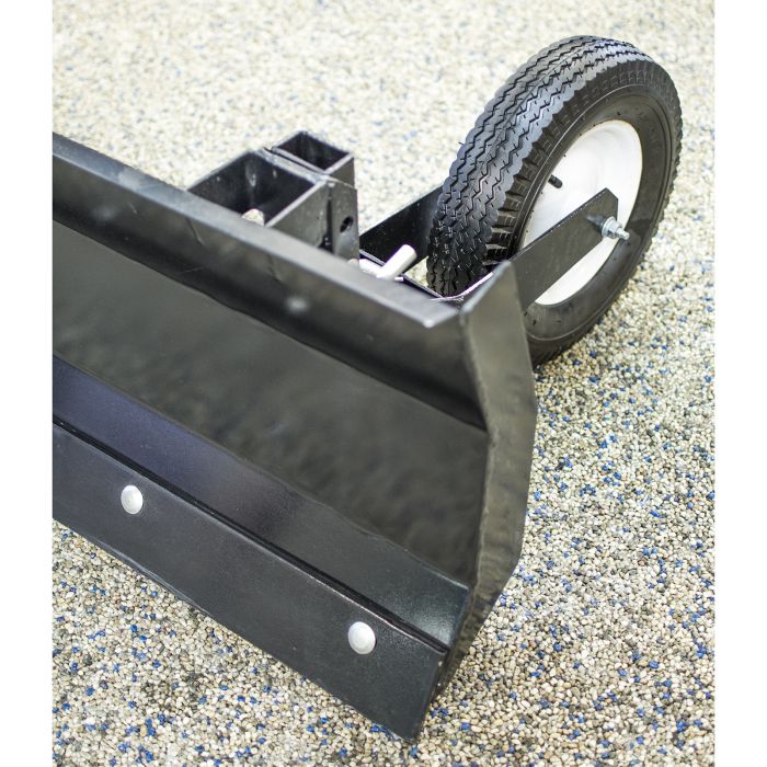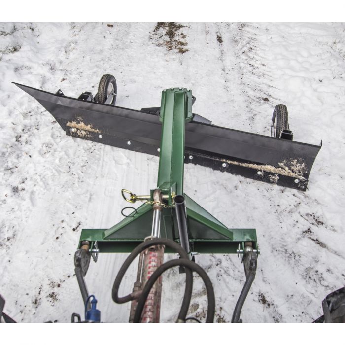 Die Stützräder lassen sich mit einem Stift einfach montieren und in der Höhe verstellen, um Arbeitshöhe und -winkel des Schilds korrekt für das Schneeräumen auf nicht gefrorenen Böden, zum Glattziehen von Schotterwegen oder für andere Justierungsarbeiten einzustellen. Die Planierschildstrebe ist fest an der Dreipunkt-Halterung montiert.