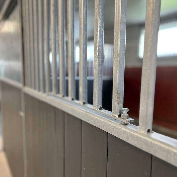 In Schweden gefertigte Front mit Gittern aus Vierkantrohr, das stabiler ist als Rundrohr und der Pferdebox ein stilvolles Design verleiht.