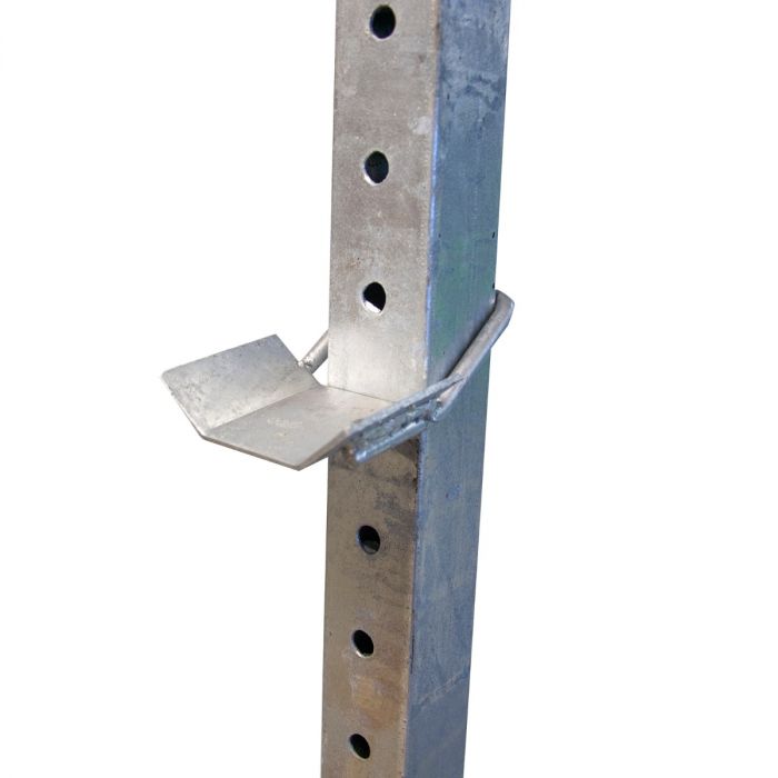 Der Hindernisständer besitzt Füße aus Vierkantstahlprofil und Löcher für die Stangenauflagen an zwei Seiten des Ständers. Höhe 180 cm.